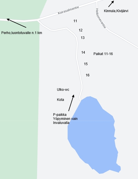 - Sähköttömät numeroidut paikat (5-10) sijaitsevat Koirasalmen kotalaavun ympäristössä sekä Heikinlammentien varressa (11-16).